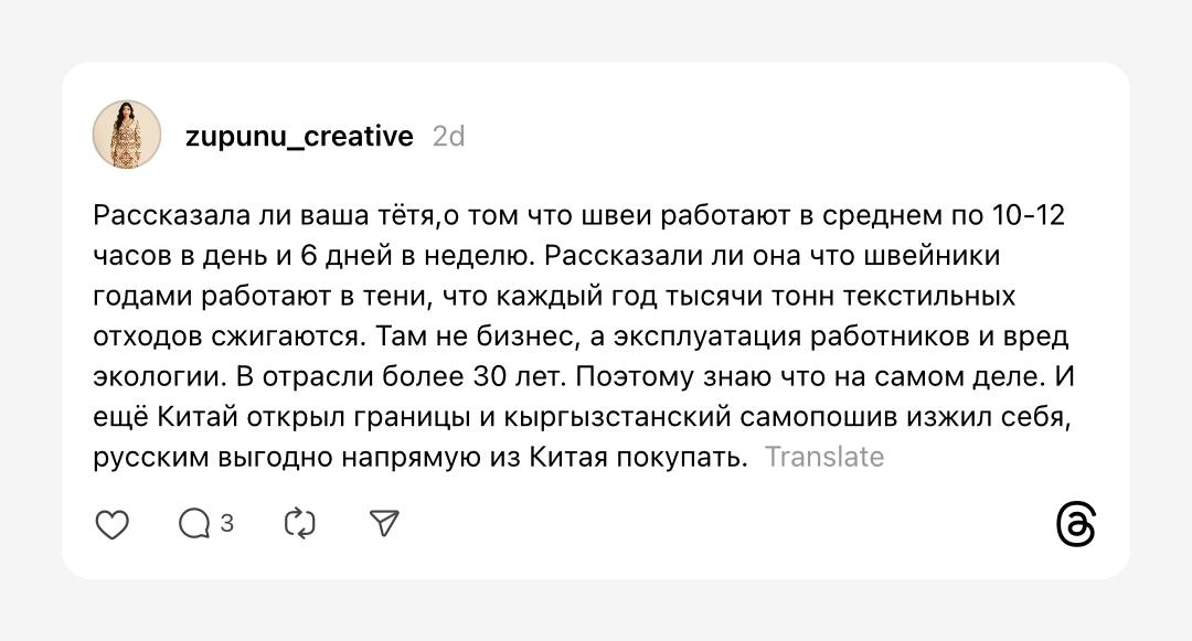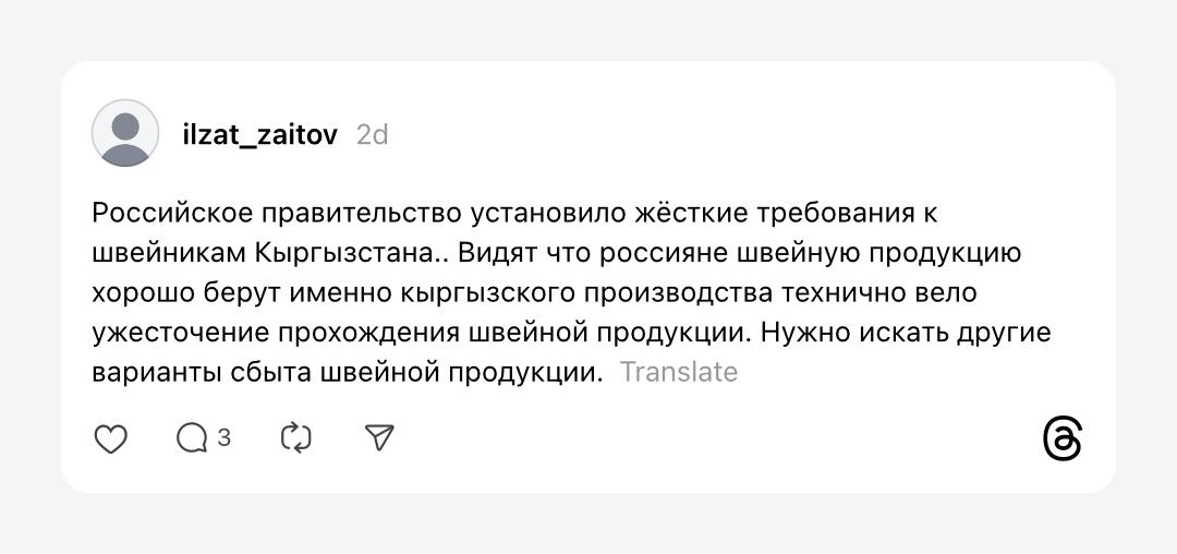 Публикация получила большой отклик в соцсети. Другие предприниматели и люди со знакомыми в швейном бизнесе рассказали о закрытии множества цехов. При этом в официальных СМИ Кыргызстана нет упоминаний о «жестких требованиях», введенных российскими властями.