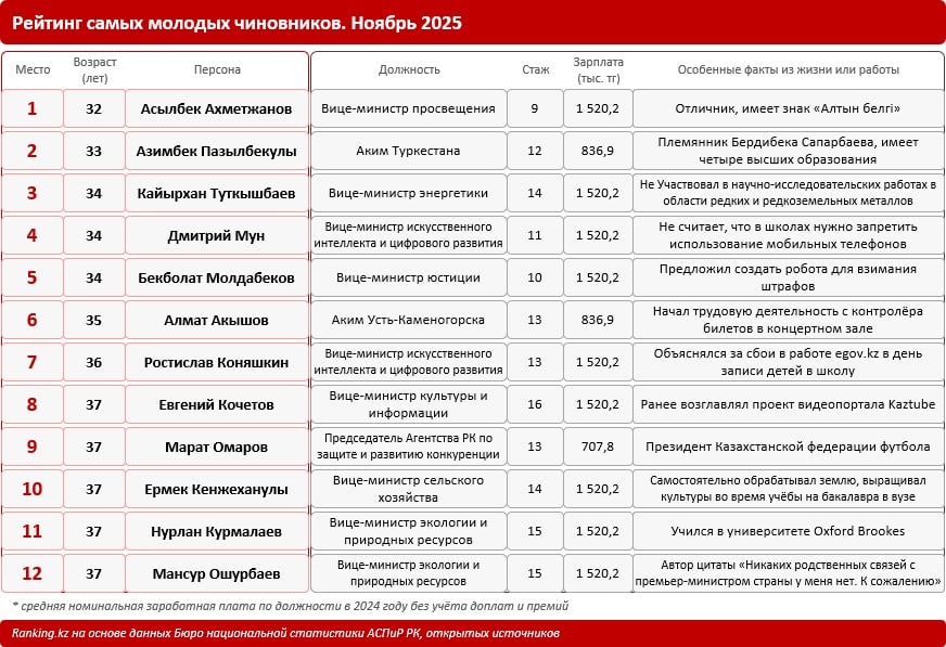 У чиновников, которые не так давно начали свой карьерный путь, по статистическим данным, зарплаты будут ниже. Самый молодой чиновник высшего эшелона власти – вице-министр просвещения Асылбек Ахметжанов. Стаж его работы всего девять лет. Ему 32 года.