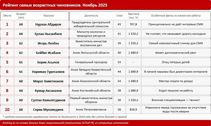 У самого возрастного Нурлана Абдирова (стаж 43 года) самая низкая зарплата среди вошедших по возрасту чиновников. Его средняя зарплата составляет примерно 708 тыс. тенге.