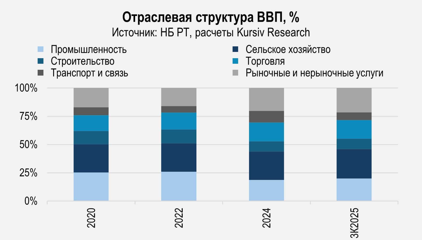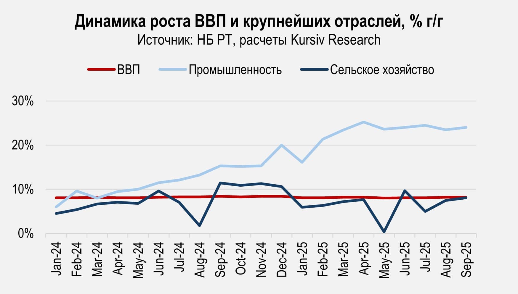 Несмотря на крайне положительную динамику промышленного производства, его доля в ВВП не растет: если брать показатели 2020 за базу, то рост промышленности составил 235%, сельского хозяйства – 150%, тогда как общий экономический рост достиг 149%. При этом, согласно данным НБ РТ, доля вышеупомянутых секторов в структуре ВВП снизилась, а доля валовой добавленной стоимости промышленных отраслей снизилась с 23,1% в 2020 до 17,7% за 9М2025. Это вызывает вопросы относительно достоверности статистического учета.
