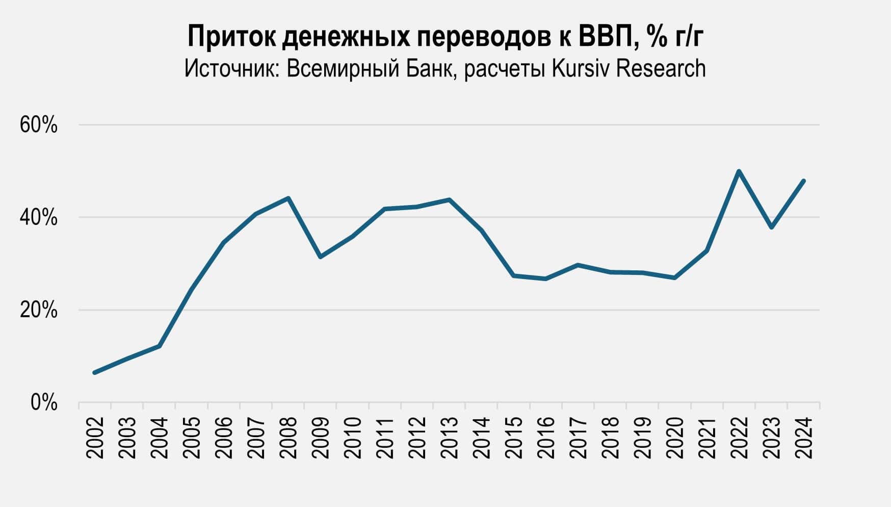 В 2024 объем денежных переводов вырос более чем на 45%, достигнув уровня в 47,9% ВВП страны. Согласно исследованию Всемирного банка, более 90% таджикских мигрантов работают в РФ, поэтому дефицит рабочей силы на российском рынке труда, рост заработных плат и укрепление рубля сыграли большую роль в увеличении притока денежных средств в республику.
