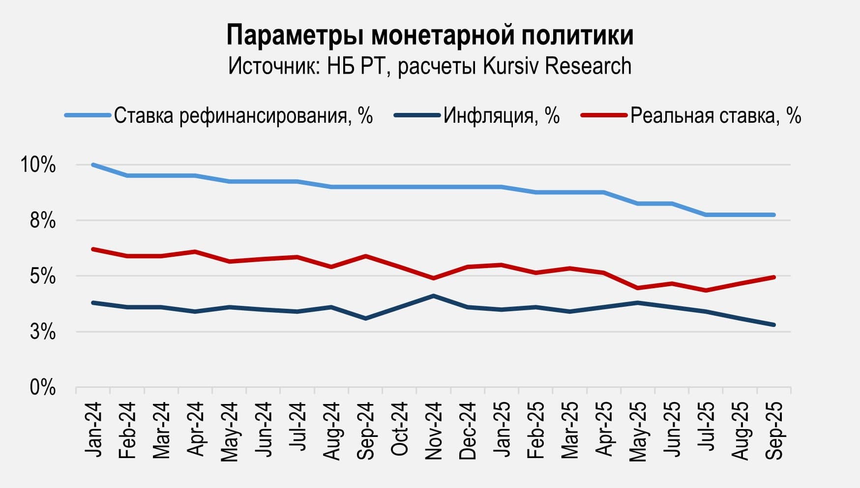 С другой стороны, реальная ставка (номинальная ставка рефинансирования минус уровень инфляции) остается достаточно высокой – порядка 4,9% в среднем за 9М2025, что свидетельствует о приверженности жесткой монетарной политике, направленной на стерилизацию избыточной иностранной валюты, поступающей в страну. Значительные притоки валюты создают риски избыточной ликвидности и перегрева экономики, а также неконтролируемого роста импорта, учитывая положительное сальдо платежного баланса и укрепление нацвалюты.
