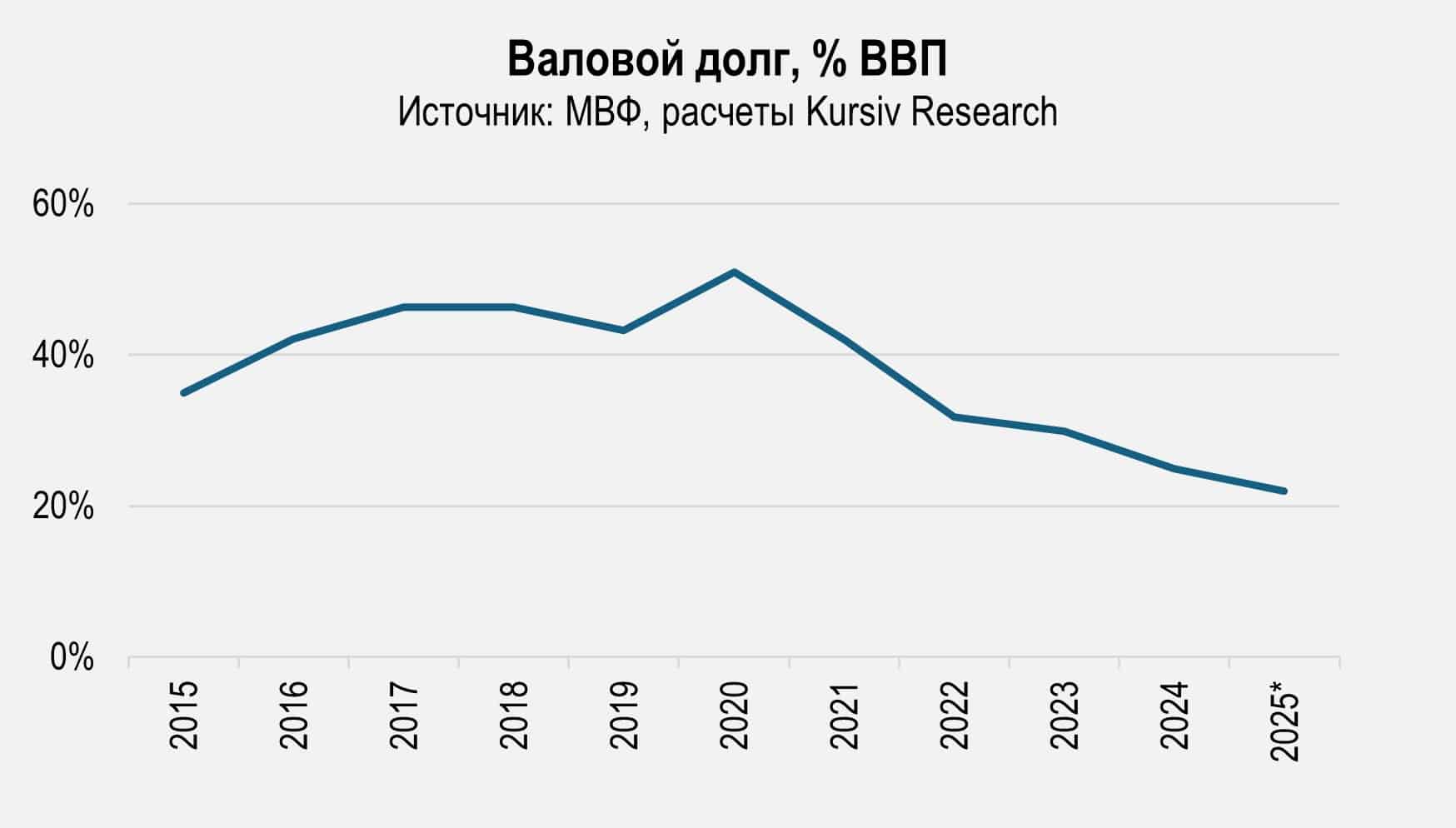 Дефицит бюджета по итогам 2025 года планируется на уровне 2,5% ВВП. Динамика государственного долга заметно улучшилась. После пика в 50% ВВП в 2020, к концу 2024 коэффициент долга резко снизился до 24,9% ВВП.