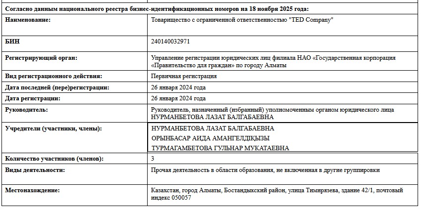 Отметим, что на официальном сайте образовательного центра указано, что бренд Tesla Education принадлежит ТОО «TED COMPANY». Руководителем предприятия является Лазат Нурманбетова. Она также входит в число учредителей фирмы вместе с Аидой Орынбасар и Гульнар Турмагамбетовой. Компания официально была зарегистрирована 26 января 2024 года.