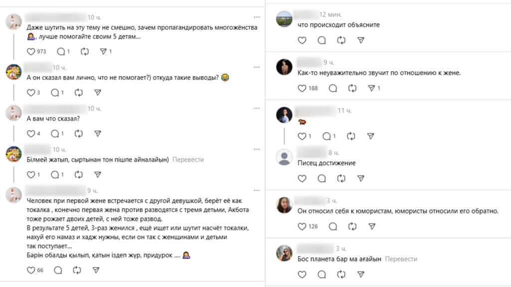 Пост быстро набрал десятки тысяч просмотров и оброс сотнями комментариев. Пользователи не упустили возможности пошутить: кто-то назвал Айдаркулова «конкурентом Ивана-многоженца», другие предложили ему «идти в Tinder».