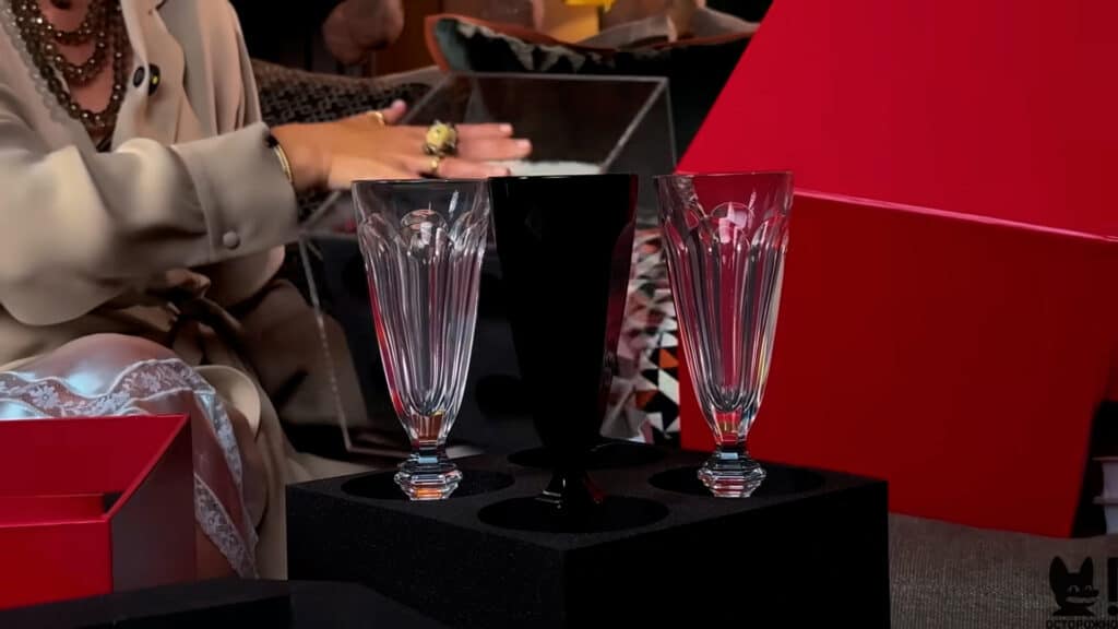 Собчак также показала бокалы Baccarat, которые ей подарила известный российский дизайнер Анастасия Задорина. Также Собчак показала редкий клатч Chanel от матери, новый iPhone, коллекционную сумку JW Anderson от Филиппа Киркорова, светящуюся сумку Birkin-ночник, дизайнерские вещи и альбомы от друзей.