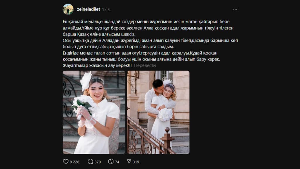 «Теперь для меня важно одно: чтобы суд прошел справедливо, чтобы следствие было честным и чтобы душа моей суженой обрела спокойствие. Необходимо довести дело до конца. Виновные должны понести наказание!» – заявил Адилет Зейнель.