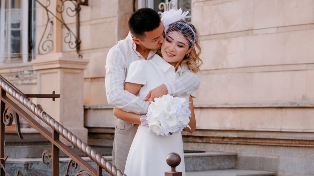 На фотографиях молодые супруги позируют в белых нарядах. В подписи Адилет Зейнель признается, что никакие медали или слова не смогут вернуть ему любимую.