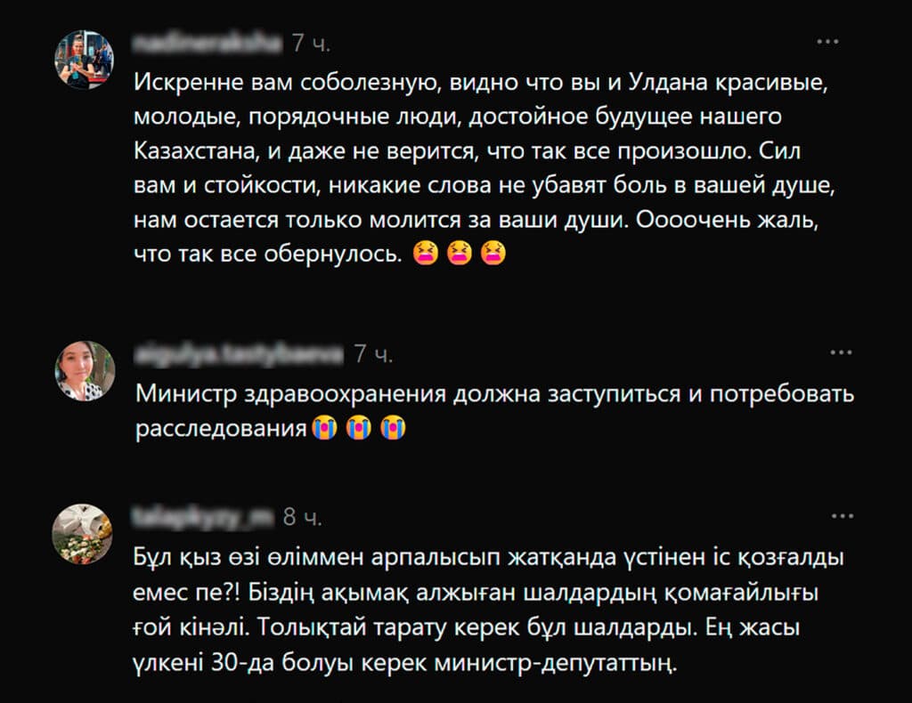 «До слез. Она выбрала правильного, надежного человека в вашем лице. Я надеялась, что ваша супруга очнется, выкарабкается. Но не случилось. Примите искренние соболезнования. Она несомненно герой. Жаны жаннатта болғай. Держитесь»