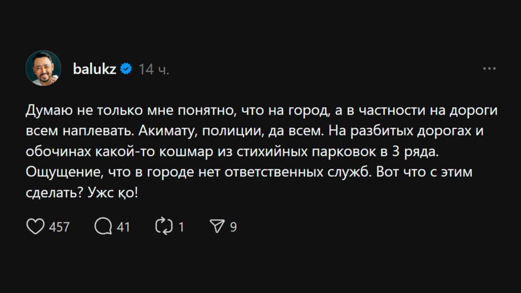 Известный казахстанский интервьюер Тимур Балымбетов возмутился состоянием дорожной инфраструктуры Алматы. В своей ветке в Threads он заявил, что на город и, в особенности, на дороги «всем наплевать».