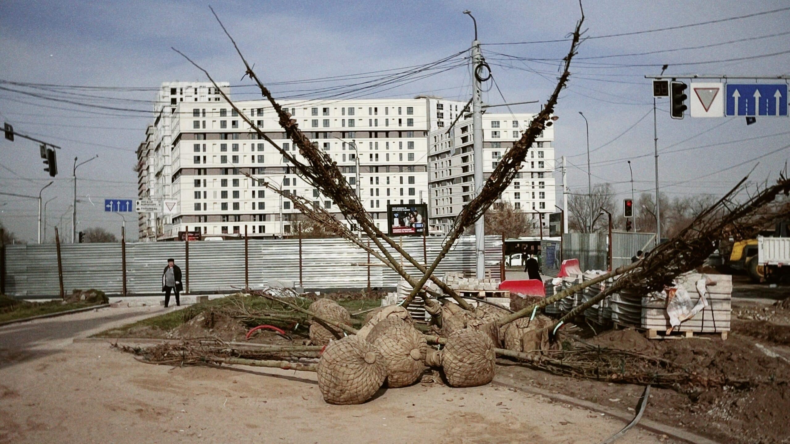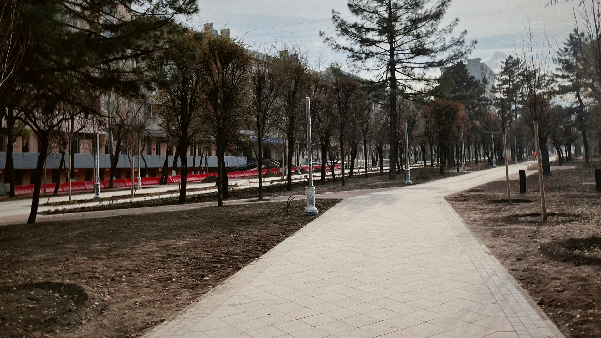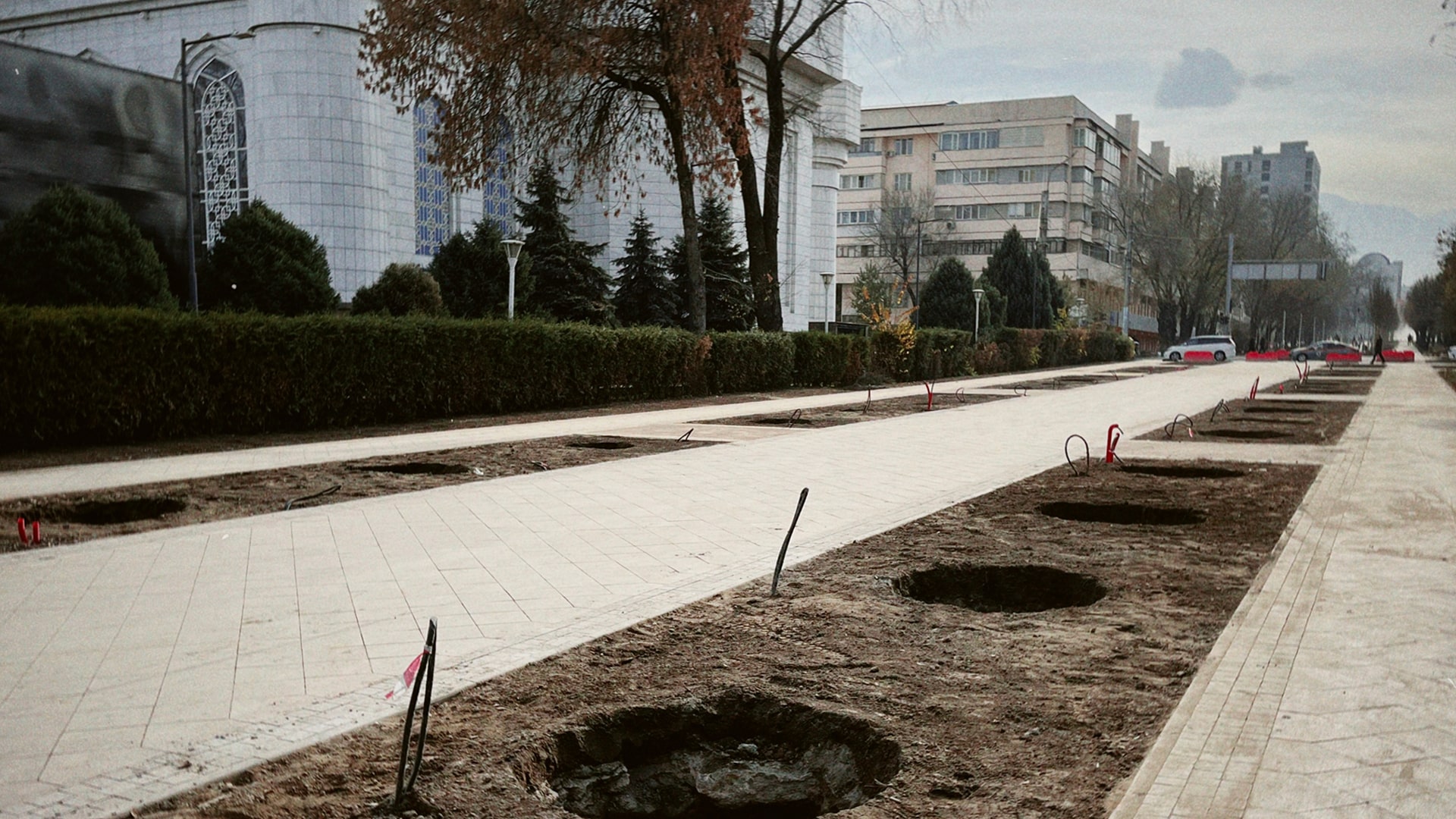 Зеленый бульвар, находившийся посередине оживленной улицы, соединили с тротуаром с восточной стороны. По всей территории выложили брусчатку, а вдоль пешеходной зоны вырыли десятки ям для новых деревьев. Многие из них уже лежат кучей на тропах и ждут посадки.