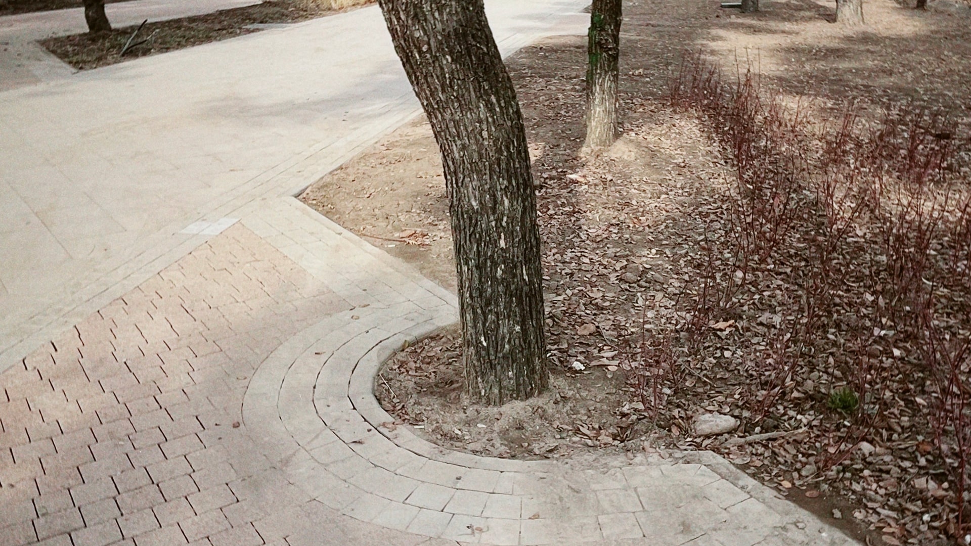 Примечательно, что деревья в разных местах аккуратно огибает тротуарная плитка.