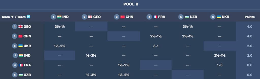 ИНДИЯ – УКРАИНА 2,5:1,5, ГРУЗИЯ – УЗБЕКСТАН 3,5:0,5, КИТАЙ – ФРАНЦИЯ 2,5:1,5
