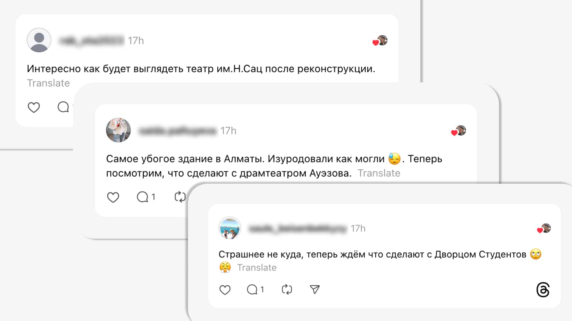 Другие же ценители старого облика города боятся, что такая же участь ждет другие знаковые здания Алматы. Сейчас в городе одновременно ремонтируют два театра: ТЮЗ им. Н. Сац и драмтеатр им. Ауэзова. Оба регулярно попадают в СМИ из-за возмущений алматинцев.