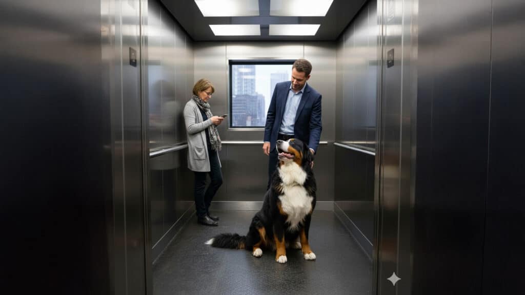 Если у вас большая собака, стоит спросить у остальных пассажиров разрешения зайти вместе с питомцем или дождаться, когда кабина приедет свободной. Большой пес должен быть на коротком поводке и обязательно в наморднике. В таких ситуациях хозяин входит и выходит первым, чтобы животное спокойно следовало рядом, не мешая окружающим.