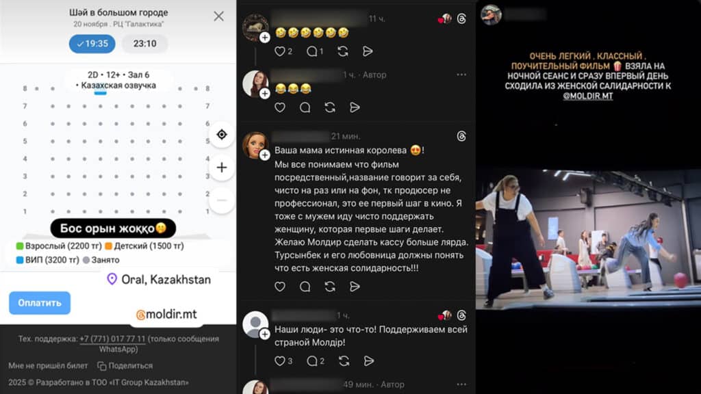 Сама Молдир Муканова в своих Stories в Instagram активно делится свидетельствами успеха и позитивными отзывами. В одном из сторис демонстрируется скриншот с киноафиши в Уральске с пометкой «Свободных мест нет». Это свидетельствует о высоком зрительском интересе в регионах.