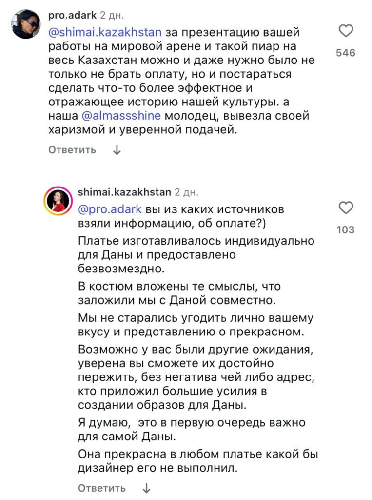 Впрочем, под видео с демонстрацией наряда его все же обсудили казахстанцы. Так, одна из подписчиц Алмасовой отметила, что платье было сшито на собственные деньги участницы и дизайнер могла бы не брать оплату с девушки, когда дело касается конкурса мирового масштаба. На что дизайнер ответила весьма развернуто.