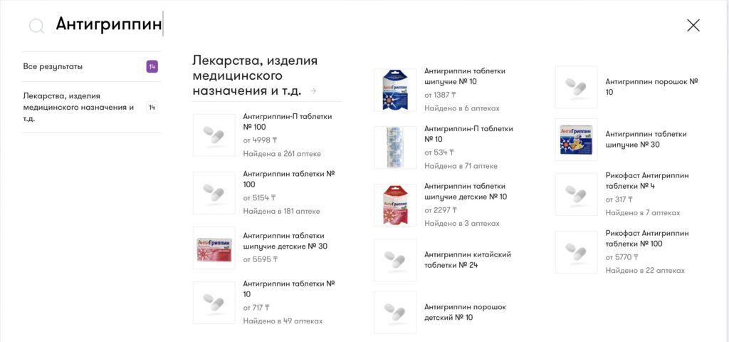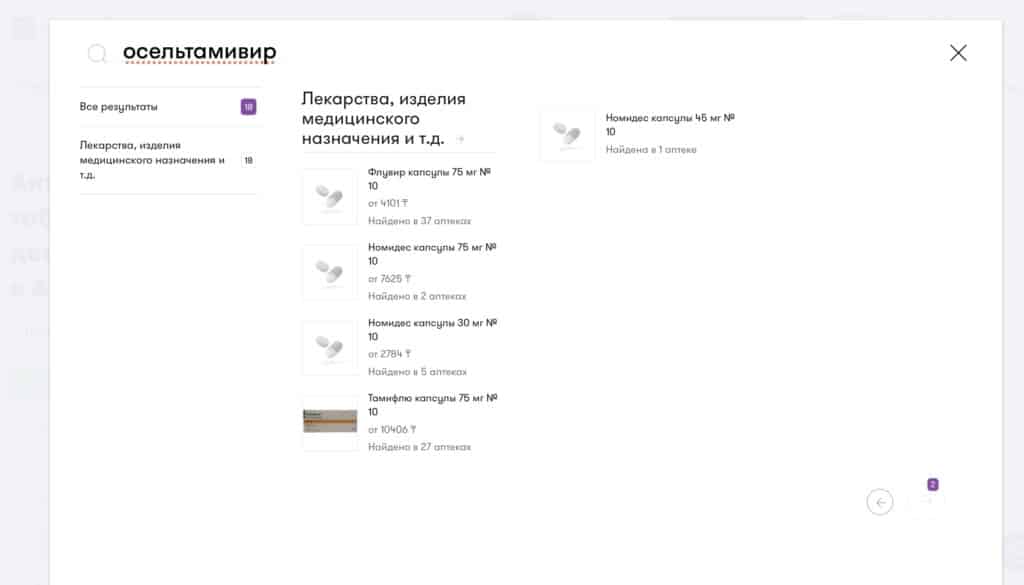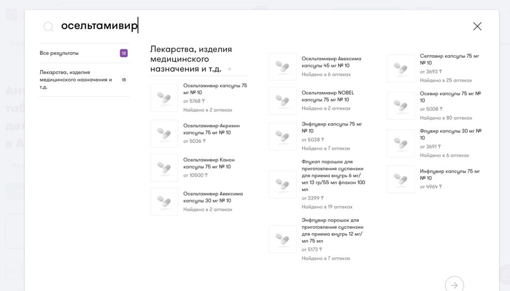 Также в онлайн-базе есть 18 наименований лекарств, где действующим веществом является осельтамивир, включая аналоги («Селтавир», «Флувир», «Тамифлю» и прочие). Цены колеблются от 3 600 до 10 500 тенге, а наличие — от одной до 80 аптек.