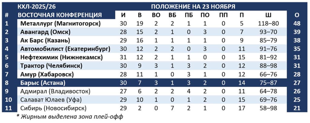 Потерпев 19-е фиаско в сезоне, «Барыс» отступил на восьмое, рубежное место в таблице Восточной конференции. По потерянным очкам казахстанцы уступают еще и «Адмиралу».