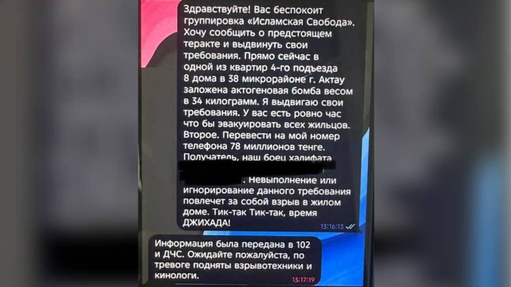 «Здравствуйте! Вас беспокоит группировка «Исламская свобода». Хочу сообщить о предстоящем теракте и выдвинуть свои требования. Прямо сейчас в одной из квартир 4-го подъезда 8-го дома в 38-м микрорайоне Актау заложена «актогеновая бомба» весом в 34 кг. Я выдвигаю свои требования. У вас есть ровно час, чтобы эвакуировать всех жильцов. Второе, перевести на мой номер телефона 78 млн тенге. Получатель – наш боец халифата (ФИО не будет разглашено, так как данные несовершеннолетнего)», – сказано в сообщении, которое подросток отправил в Telegram-канал «1414».