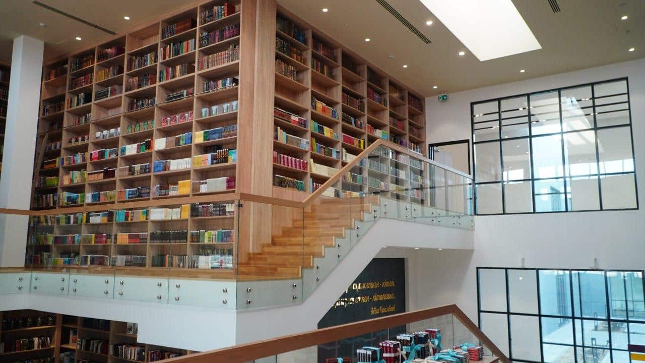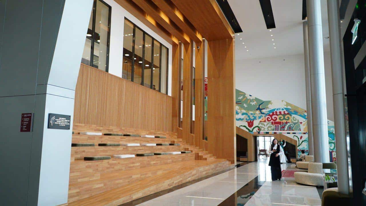 По словам Камзебаева, центр впечатляет масштабами. Он показал огромные книжные стеллажи, коворкинг и читальный зал, где любой может прийти поработать или почитать.