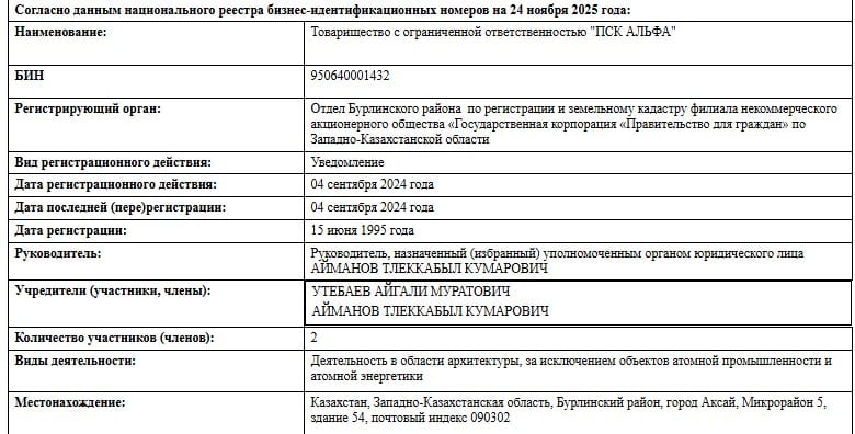 Отметим, что за исполнение ПСД отвечает компания ТОО «ПСК-Альфа» под руководством Тлеккабыла Айманова. Он также является учредителем вместе с Айгали Утебаевым.