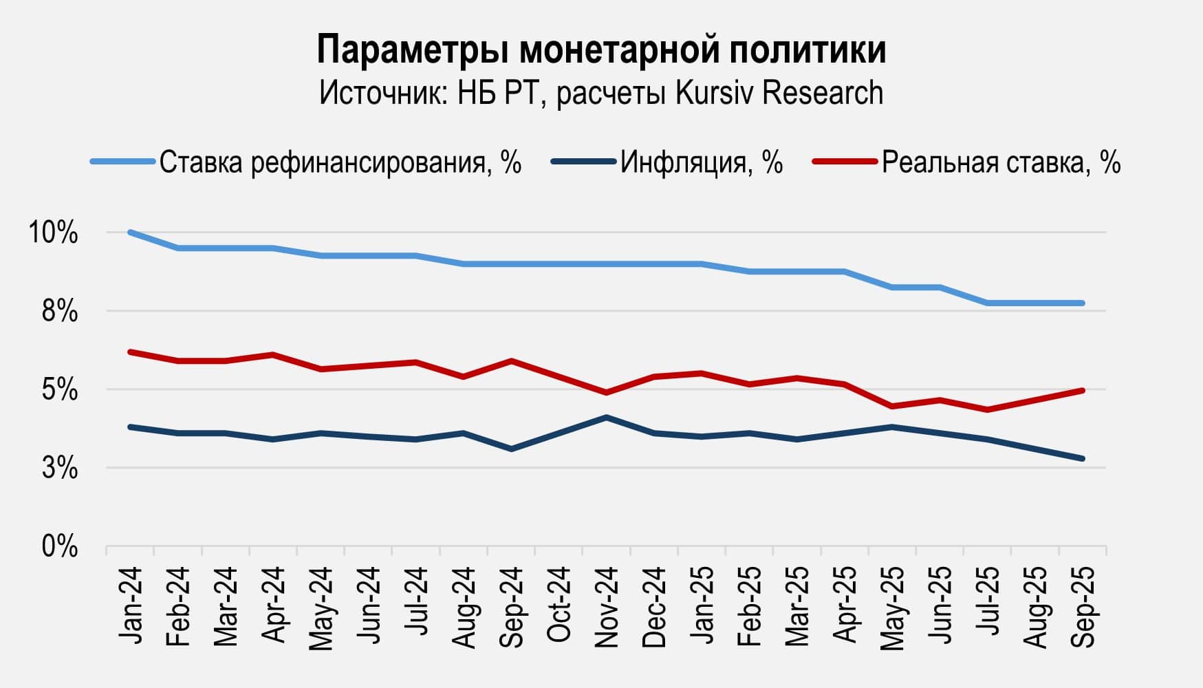 На фоне низкой потребительской инфляции, которая с начала 2025 года находилась в диапазоне 3-4%, НБ РТ трижды снижал ставку рефинансирования, установив ее на одном из самых низких уровней за 10 лет (в середине августа 2025 года — 7,75%). Реальная ставка в течение года постепенно снижалась с 5,5% в январе до 4,5-5% в 3К2025, что позволяет регулятору сдерживать инфляционное давление и исполнять ключевой приоритет своей монетарной политики. Учитывая снижение потребительской инфляции до 2,8% в сентябре и рост реальной ставки выше 5%, 3 ноября 2025 регулятор принял решение произвести дальнейшее смягчение монетарной политики на 25 б.п.