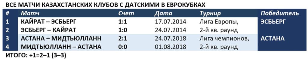 До сих пор дороги казахстанцев и датчан лишь дважды пересекались в еврокубках. В квалификации Лиги Европы-2014 «Кайрат» под руководством Владимира Вайсса уступил «Эсбьергу» – 1:1, 0:1. Через четыре года «Астана» Григория Бабаяна в отборе к Лиге чемпионов прошла «Мидтьюлланн» из Хернинга – 2:1, 0:0.