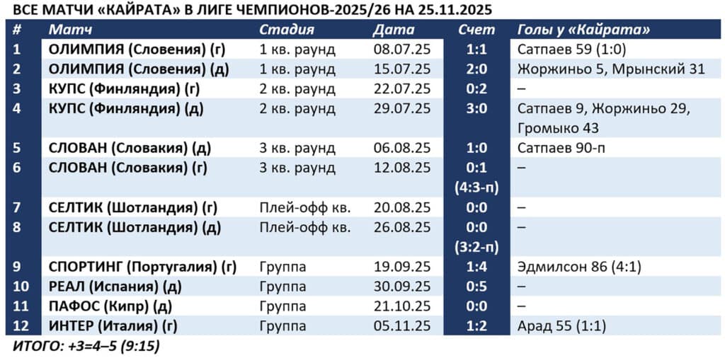Показатели «Кайрата» в нынешней Лиге чемпионов несколько хуже датских. Подопечные Рафаэля Уразбахтина с громадным трудом преодолели барьеры квалификации, в которой дважды дело доходило до послематчевых пенальти. Без шансов проиграв «Спортингу» и «Реалу» в основном турнире, «Кайрат» весь матч играя в большинстве, не дожал кипрский «Пафос». После чего эпизодами неплохо смотрелся на легендарном «Сан-Сиро», но уступил и там.