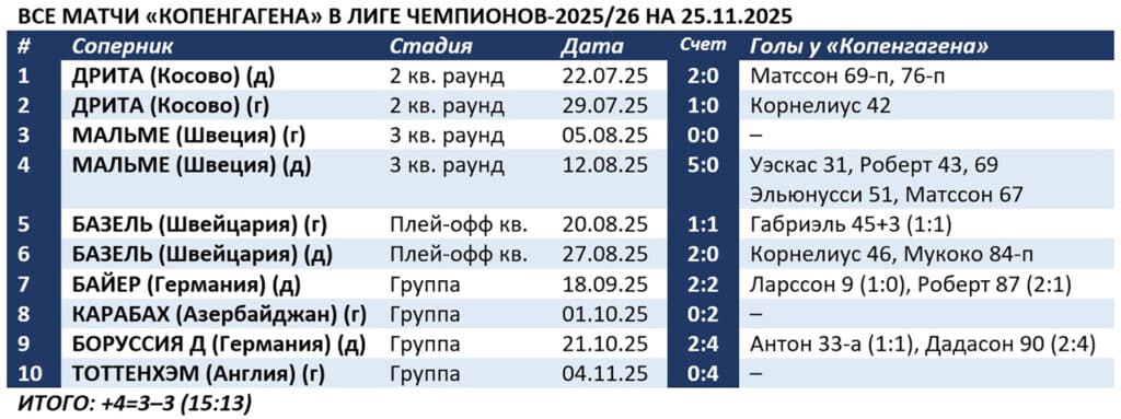 Квалификацию Лиги чемпионов «Копенгаген» прошел на одном дыхании – четыре виктории, две ничьи и разница голов 11:1. Сыграв дома вничью с немецким «Байером» 2:2, датчане за здравие начали и основной турнир. После чего потерпели четыре фиаско подряд с общим счетом 2:10.