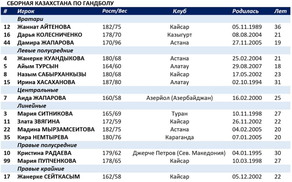 В отличие от дебютантов (Египта, Швейцарии и Фарер), сборная Казахстана восьмой раз примет участие в чемпионате мира. Больших успехов наши девушки не добивались, но один, а то и пару матчей непременно выигрывали. В рамках подготовки к чемпионату мира женская гандбольная сборная Казахстана выиграла серебряные медали на недавних Играх исламской солидарности в Эр-Рияде, уступив в финале Турции – 31:34.