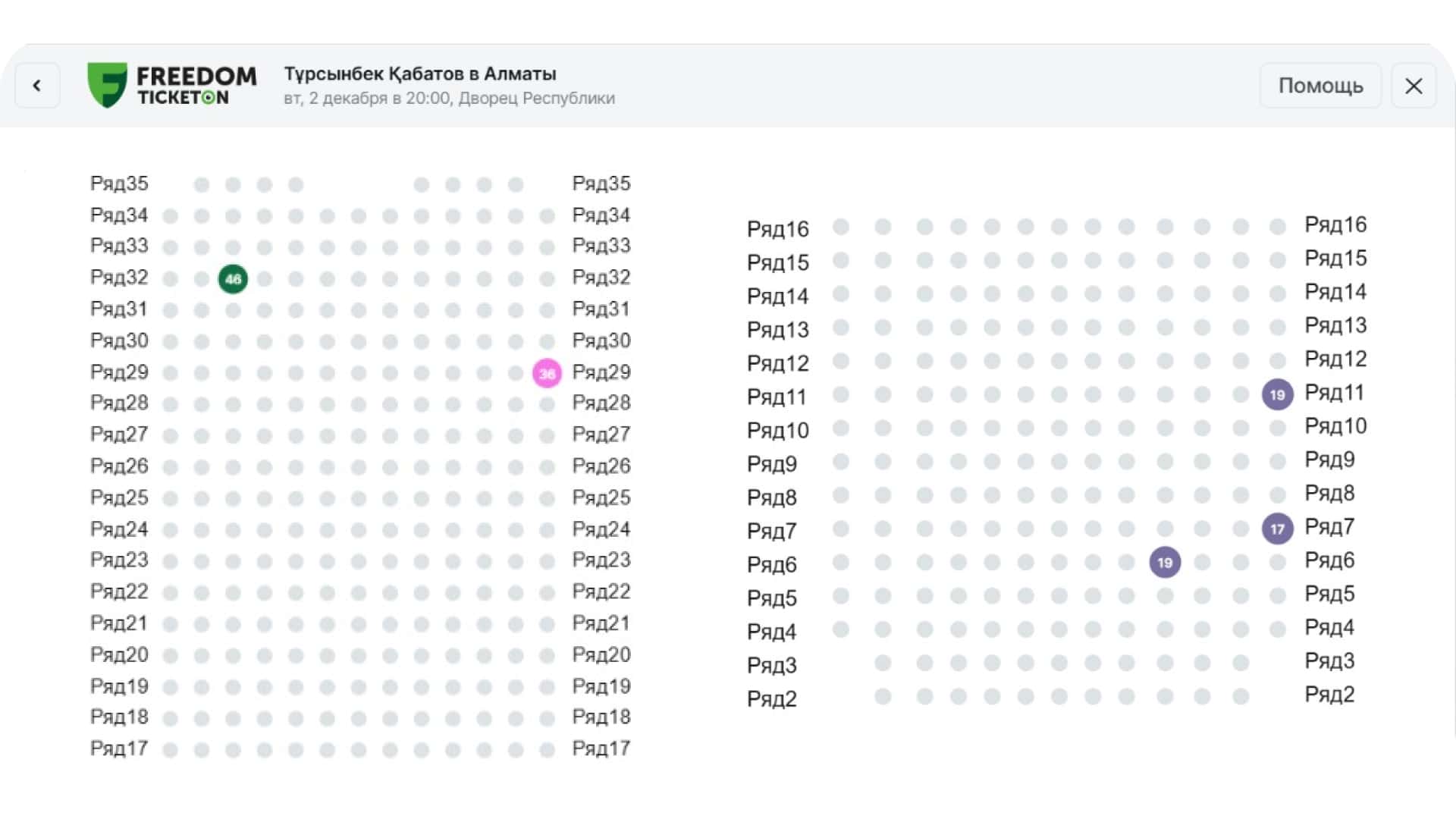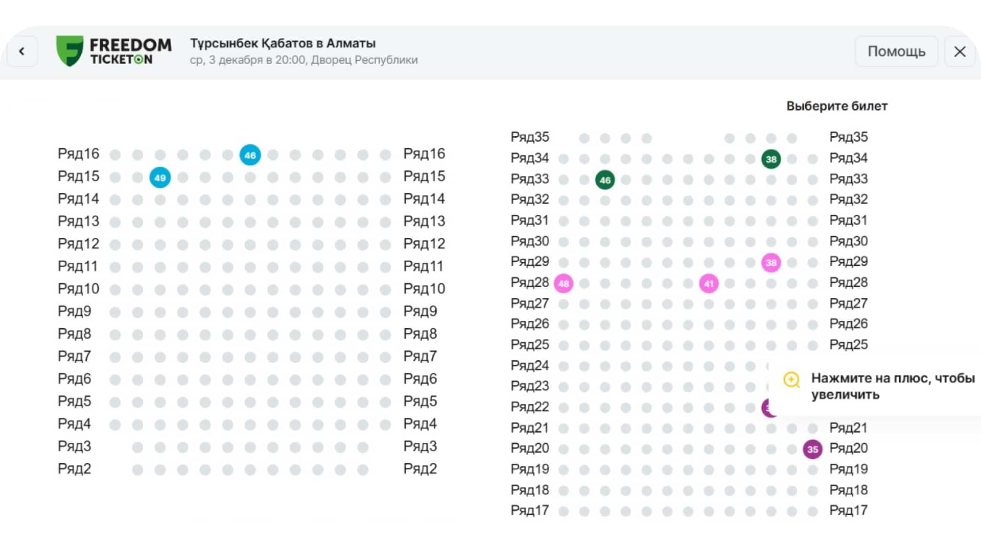 Места в зале уходят активно, стоимость билетов начинается от 5 тысяч тенге, и свободных точек на схеме становится все меньше.