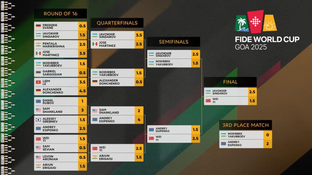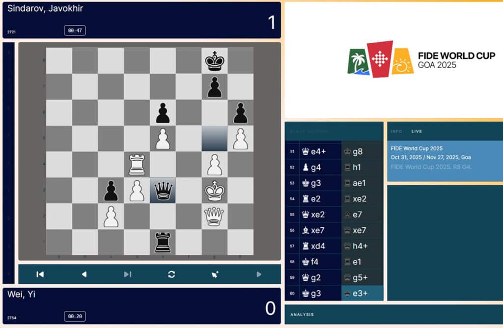 19-летний ташкентец Джавохир Синдаров (2721) одолев на тай-брейке финала 26-летнего Вэй И (2754) из Китая выиграл Кубок мира по шахматам, проходивший на индийском Гоа. Предыдущим владельцем почетного трофея был норвежец Магнус Карлсен (2839). Лидер мирового рейтинге в классике, рапиде и блице в нынешнем турнире участия не принимал.
