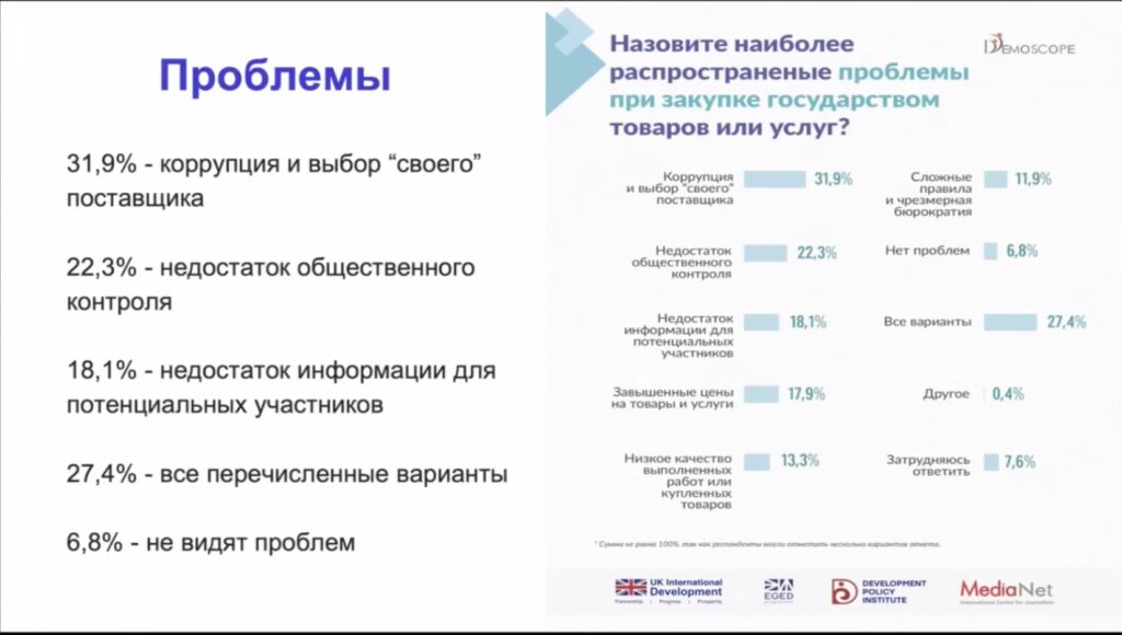 Согласно исследованию, граждане воспринимают систему закупок как закрытую, а главной проблемой называют коррупцию и практику привлечения «своих поставщиков» — так считают 31,9% опрошенных. На втором месте — отсутствие общественного контроля (22,3%), затем — сложный доступ к информации (20,2%).