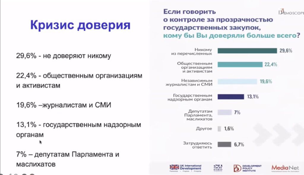 На дискуссии также были представлены результаты опроса (1 100 респондентов) Demoscope, проведенного в октябре 2025 года, по теме отношения населения к госзакупкам, контролю за бюджетом и «Бюджету народного участия».