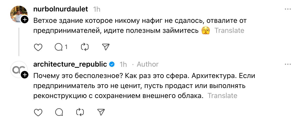 Официально никаких зданий по такому адресу среди актуального списка памятников архитектуры не числится. Kursiv LifeStyle отправил запрос в акимат города по поводу ценности здания для истории города и новых планов властей. На момент публикации комментариев от ведомства не последовало.