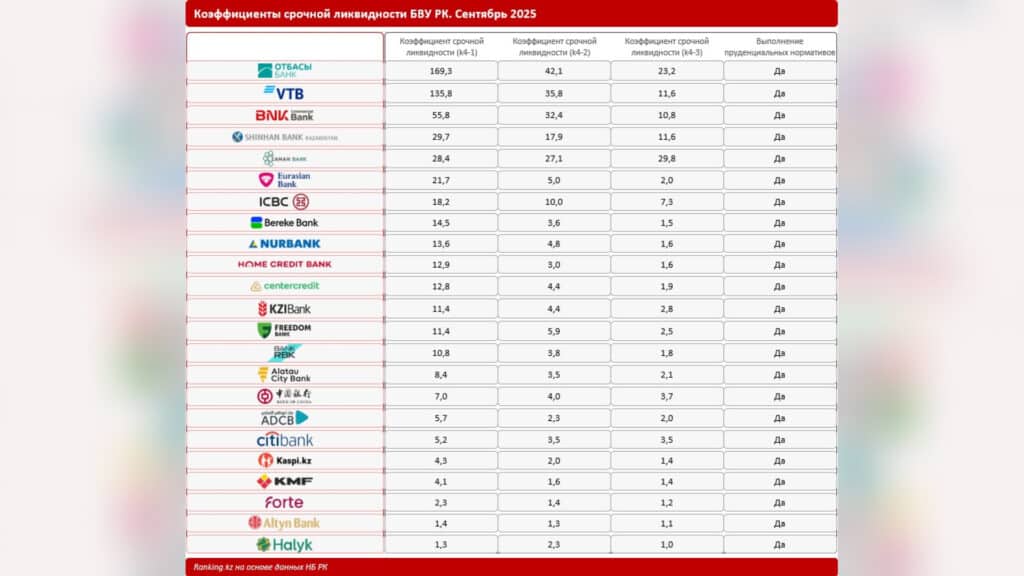 Аналитики Ranking составили рейтинг казахстанских банков по показателю коэффициента срочной ликвидности ‒ то есть способности погасить свои обязательства перед клиентами, реализовав самые ликвидные активы. Крупные казахстанские банки, включая крупнейший по активам Halyk Bank, оказались внизу списка.