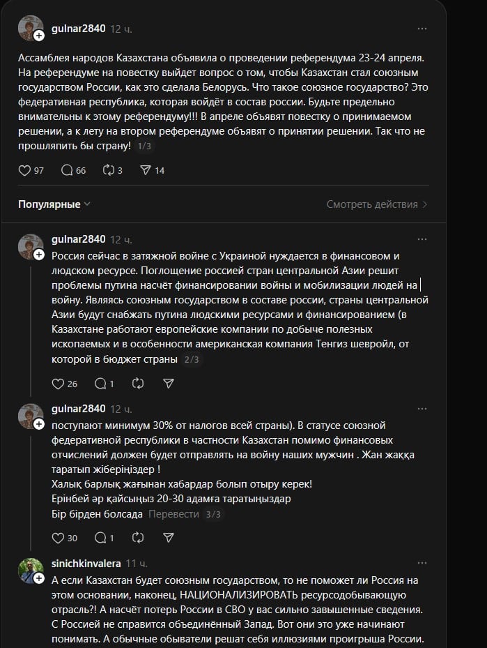 Пользовательница Threads gulnar2840 заявила, что референдум решит, станет ли Казахстан «союзным государством» России. По словам автора, после страна потеряет свою независимость.