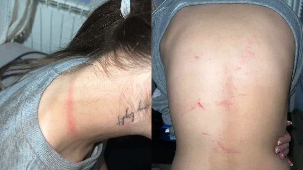 «Душил ремнем и руками, брал за волосы и бил об бардачок машины, кинул на землю, пинал по ребрам, бил руками по голове. Она пыталась убежать, он ее догнал, заставил сесть в машину, не выпускал из машины. Когда она попыталась позвонить маме, кинул ее на землю и начал бить за это. Она кричала, что ей больно. Он сказал: «умирай, мне все равно», оскорблял. Сотрясение мозга, повреждение мягких тканей височной доли, царапины и следы на шее. Моя девочка кричала «МАМА»! Видите тут жестокость? Это зверство! Посмотрите, какое существо учится в академии МВД», — написала девушка в Instagram.