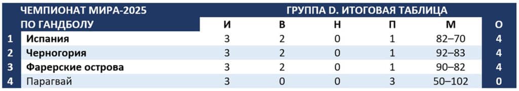Парагвайки, как и уругвайки, проиграли все матчи в квартете D. Единственной на сегодняшний день группе, в которой три сборные набрали в итоге по четыре очка. Испания победила Черногорию (31:26), но проиграла дебютанткам ЧМ Фарерам (25:27). Экс-югославки были сильнее девушек с Овечьих островов – 32:27. И все три сборные не оставили шансов Парагваю.