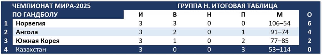 Проиграв кореянкам 17-й из 19 очных поединков, сборная Казахстана заняла последнее место в группе. И, в отличии от Норвегии, Анголы и Южной Кореи, отправляется в утешительный турнир. Октет сборных-неудачниц, разбитый на два квартета, оспорит места с 25-го по 32-е. За 25-е полагается приз – Кубок президента ИХФ.