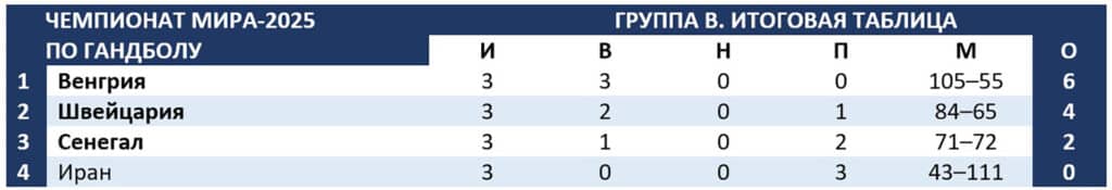 Турнир в группе В выиграла Венгрия. Подопечные одессита Владимира Головина в решающем матче за первое место не без труда переиграли дебютанток чемпионата мира швейцарок – 32:25.