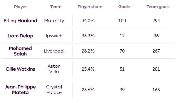 Доля Холанда в голах своей команды (свыше трети) – самая высокая в истории АПЛ. На втором месте находится Лиам Делап с показателем 33,3% (ровно треть). Казалось бы, 22-летний англичанин, с этого сезона выступающий за «Челси», совсем ненамного отстает от 25-летнего норвежца. Однако на самом деле их достижения несопоставимы. Делапу, чтобы добиться своих 33,3%, достаточно было забить всего 12 голов за свой малорезультативный «Ипсвич».