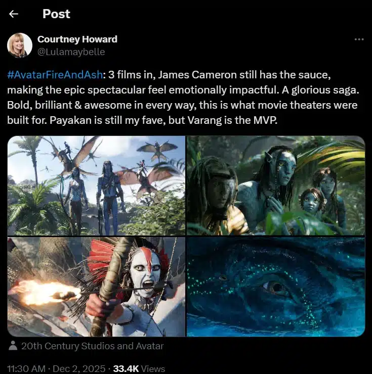 Критик Шон Таджипур добавил, что «Пламя и пепел» продолжает расширять границы визуального повествования с каждым кадром, а Перри Немирофф из Collider отметила магию фильма и глубокое погружение в мир Пандоры.