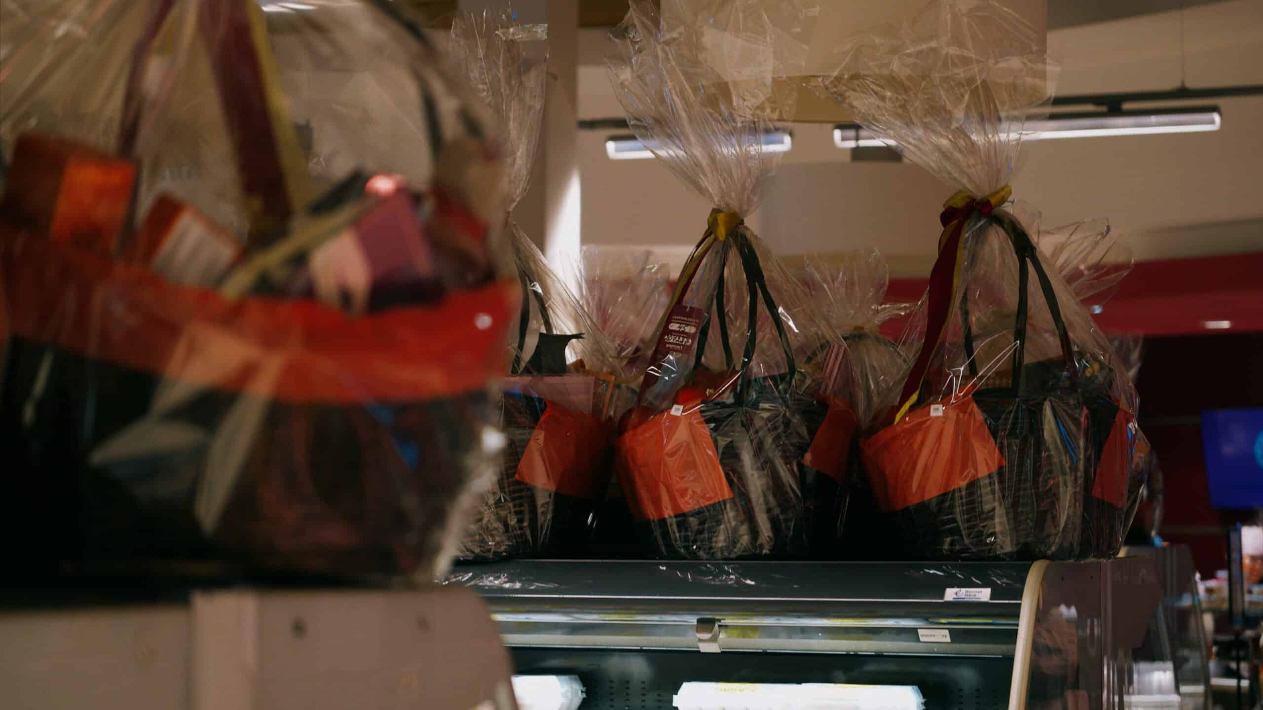 По словам одной из сотрудниц Galmart в ТРЦ Forum, каждый магазин устанавливает наполнение подарков и цены сам. Еще есть возможность собрать свою корзину, оплатив украшения отдельно. Наполнение у наборов разнообразием не поражает. Это обычные продуктовые корзины, но в целлофане с бантом. В них могут быть сладости, кофе, чай, маленькая игрушка или украшение, а также снеки, пастила и соки.
