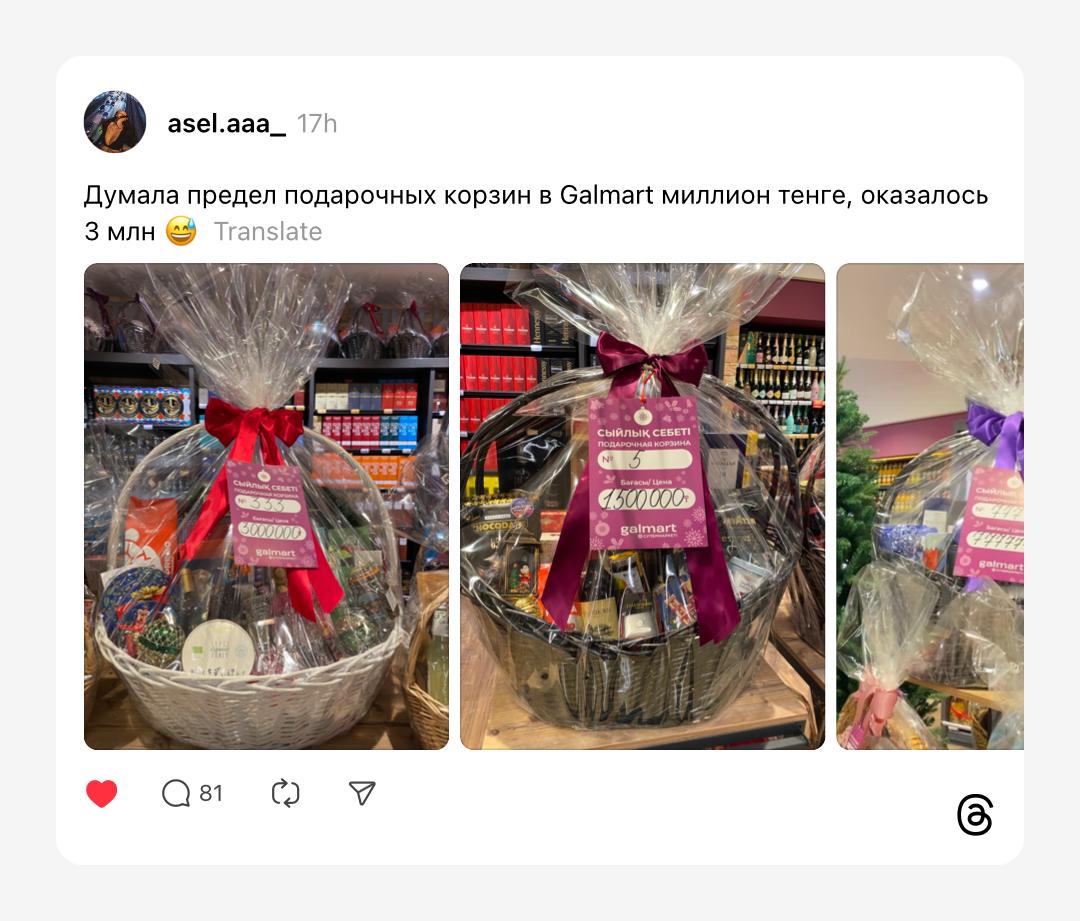 В Threads завирусился пост одной покупательницы магазина Galmart. Автор опубликовала снимки с подарочными корзинами одного из магазинов сети. Оказалось, что в гипермаркете есть множество опций на любой вкус и кошелек, даже за полтора и три миллиона тенге.