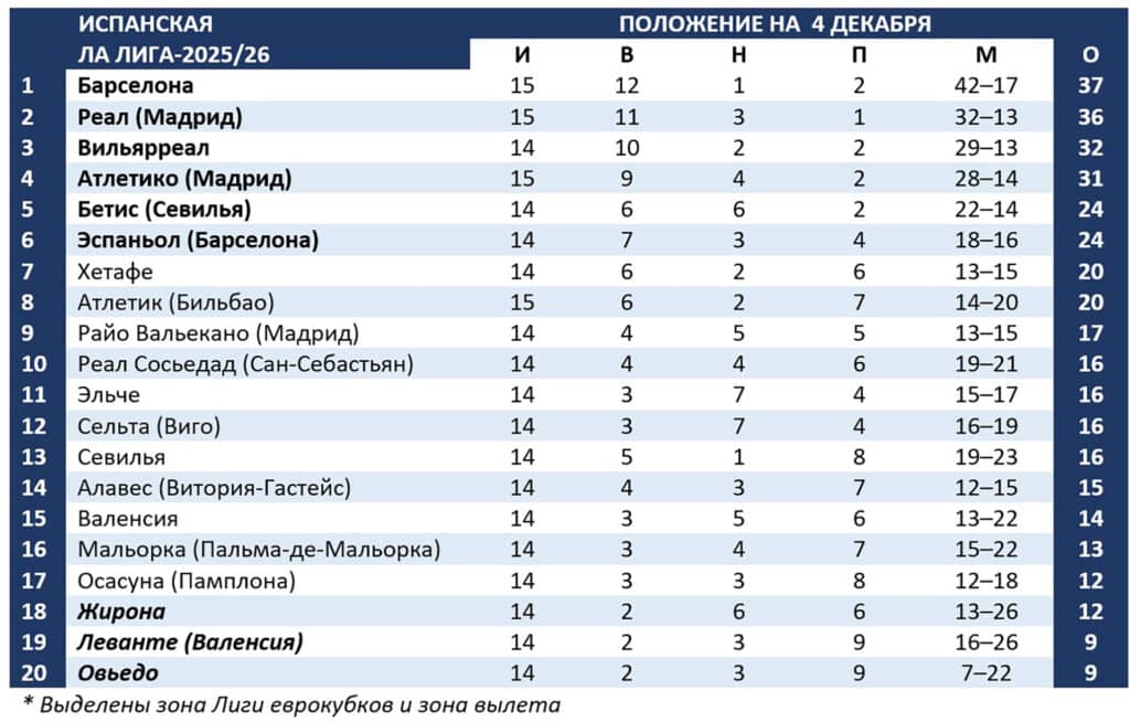 Отрыв «Сине-грантовых» от «Сливочных» остался символичным – всего один балл. Ближайшее Эль-Классико может состояться 11 января. Правда, не в Примере, а в Суперкубке Испании, матчи которого пройдут в Саудовской Аравии. 8 января «Барса» сыграет полуфинал с «Атлетиком», 9-го – «Реал» с «Атлетико». А затем, если не будет неожиданностей, финал «Реал» – «Барса». Кстати, именно из-за выездного Суперкубка две игры 19-го тура чемпионата сыграли заранее.