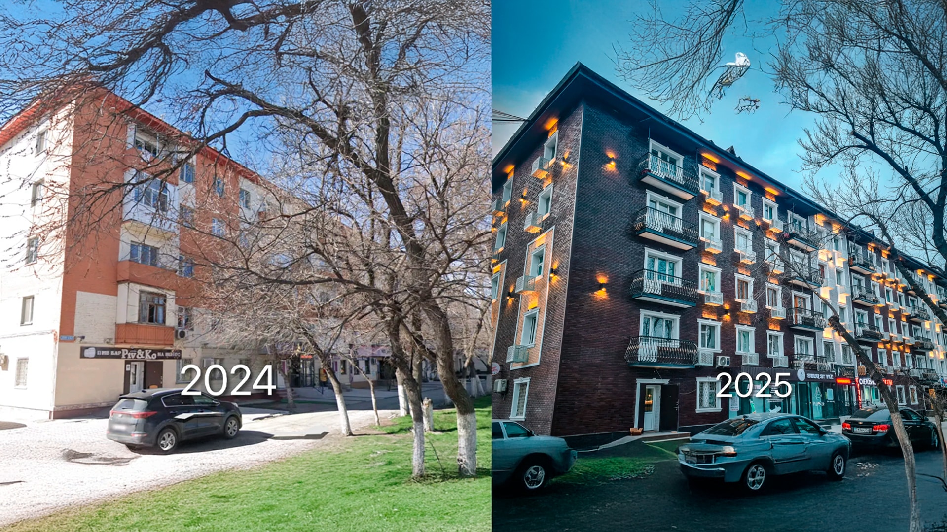 Работы затронули ряд многоэтажек на проспекте Абая и улице Конаева в Таразе. Вместо блеклых стен и хаотичных пристроек теперь аккуратный единый архитектурный стиль.