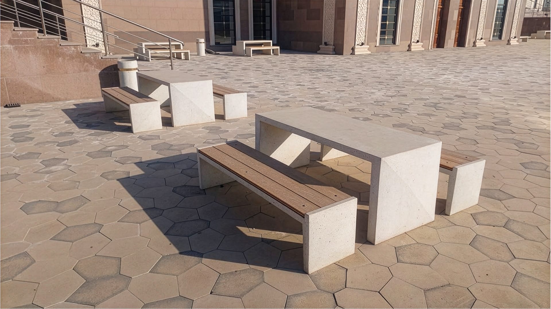 Позади мечети, на заднем ее дворе, установлены удобные каменные скамьи и столы.