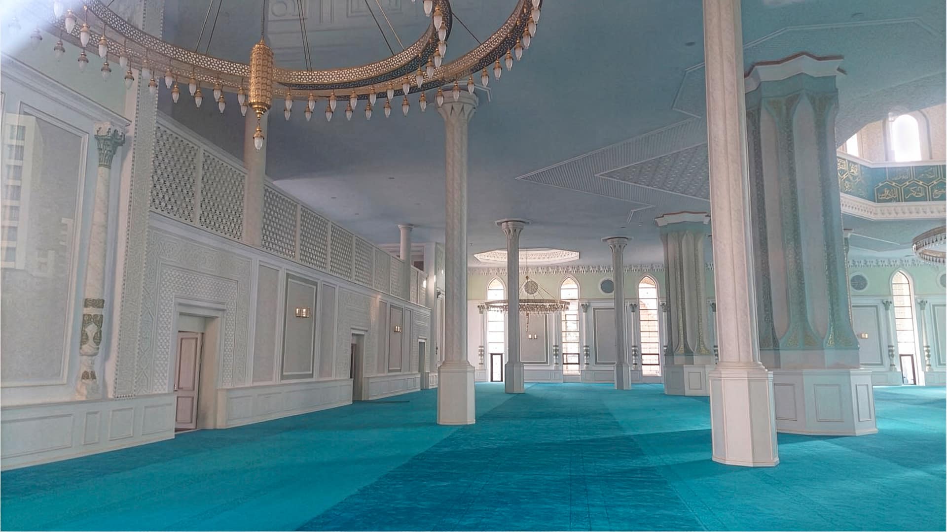 Внутри она устелена голубым ковролином с казахским орнаментом. Потолки украшают большие стеклянные канделябры, при этом каждый зал имеет свой уникальный светильник, создающий неповторимую атмосферу.